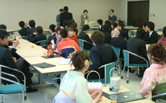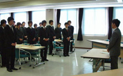 大教室で新入生の自己紹介と研究室紹介を行います。研究室紹介は各々趣向を凝らしています。