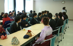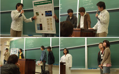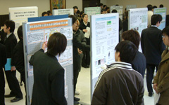 卒論発表会はポスター発表です。打ち上げ会では、卒業生と教職員に加えて大学院の先輩たちも参加します。