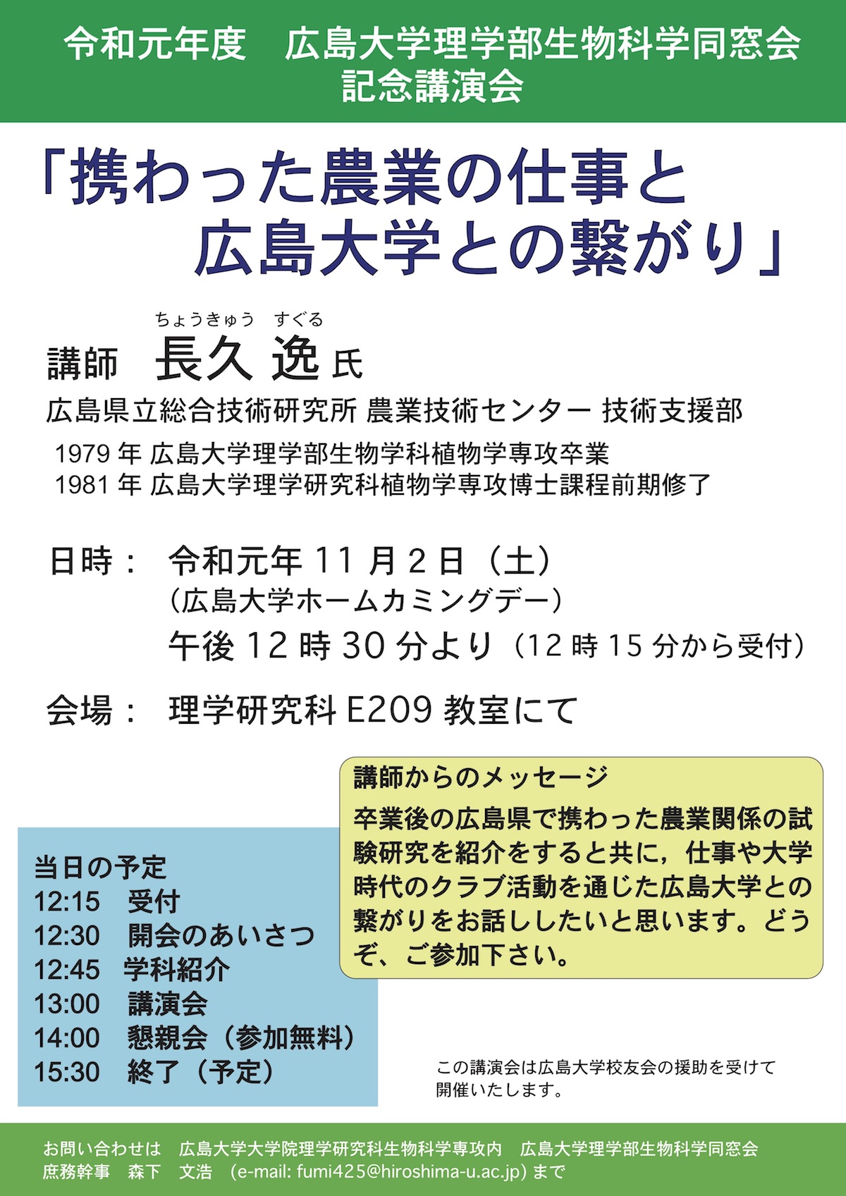 令和元年度 広島大学理学部生物科学同窓会 記念講演会を下記の要領で開催致します。本学教職員・学生、卒・修了生だけでなく、どなたでも参加できます。どうぞ、ご参加下さい。